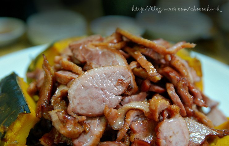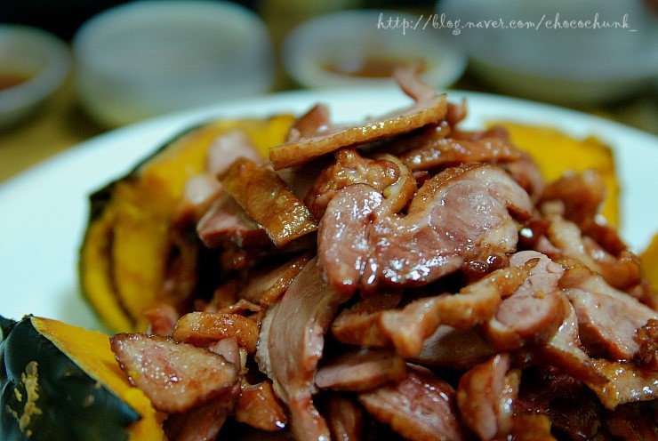 꽃처럼 펼쳐진 노오란 단호박 위에 푸짐하게 얹어진 훈제 오리구이란....>.<