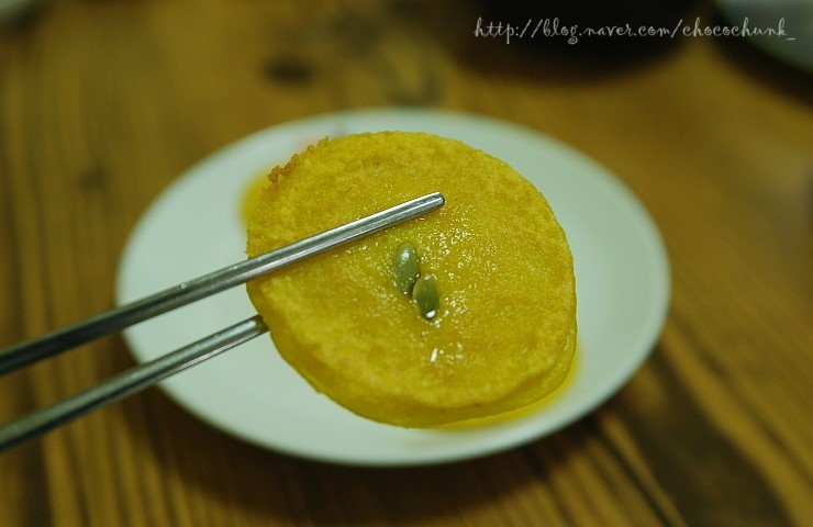 이런저런 화려한 장식도 없이 해바라기씨 한알 꾹 눌러져 나온 소박한 단호박전.