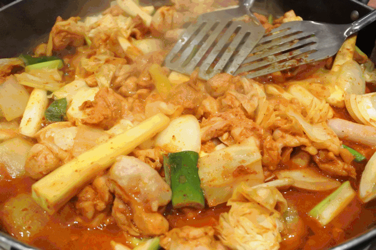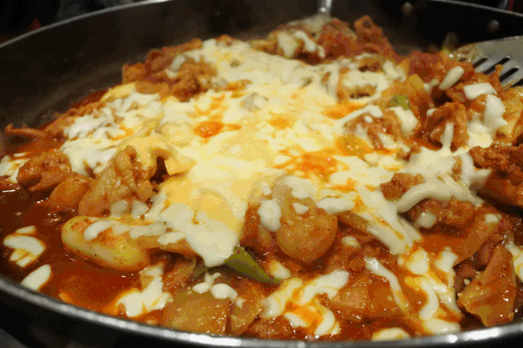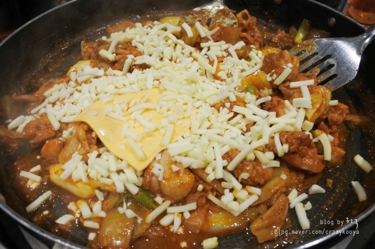 치즈가 닭갈비의 매운맛을 잡아줘 정말 잘 어우러지는 맛.