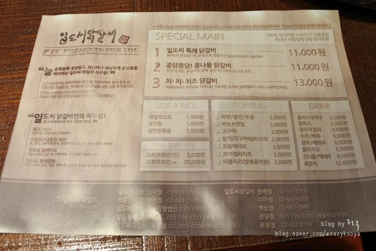 일도씨닭갈비의 간단한 설명이 있는 메뉴판.